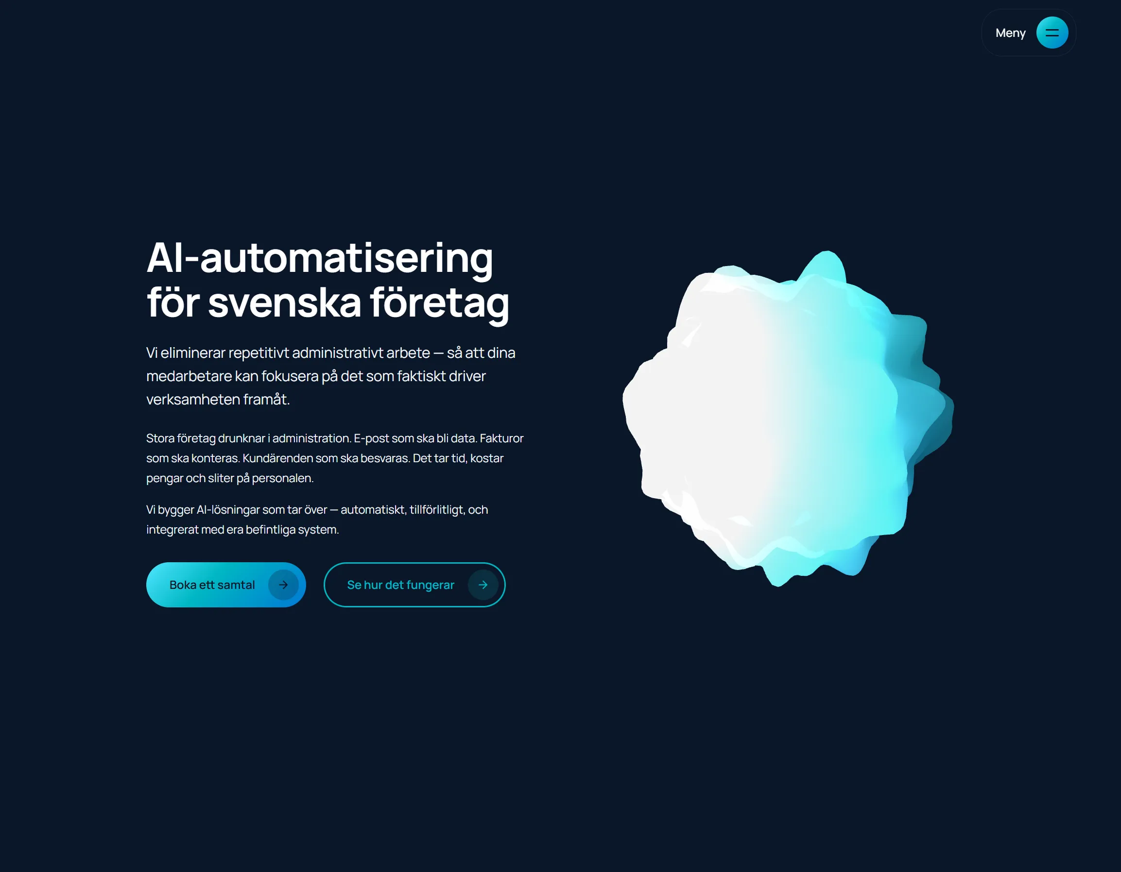 Vi landade i en mörk färgpalett med djupblå bakgrund och cyan-accenter som ger en modern, digital känsla. Gradienter och subtila glödeffekter förstärker teknik-temat utan att bli överväldigande.